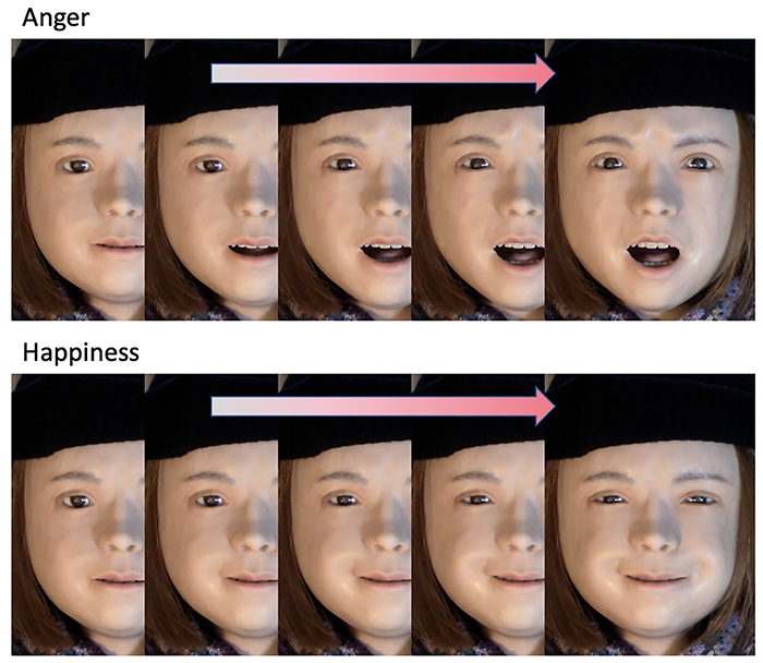 この問題を検討するため我々は,アンドロイドのニコラによる怒りと幸福の動的顔表情を,プロンプターを介して参加者に呈示した.