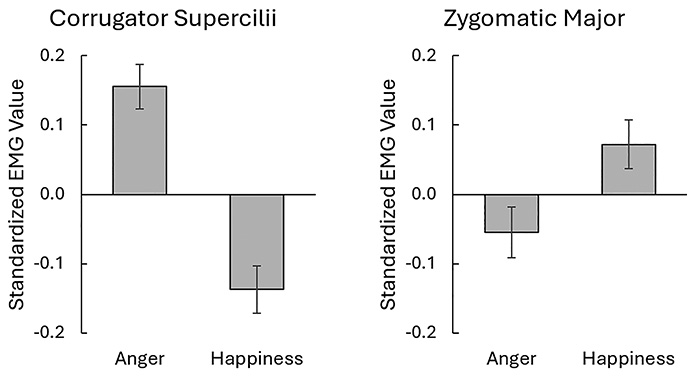 参加者の皺眉筋と大頬骨筋の筋電図を記録し,顔の動画を撮影した.