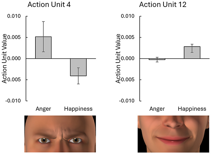幸福の表情に対しては,筋電図では大頬骨筋の活動が,動画では口角引き上げ動作が誘発された.