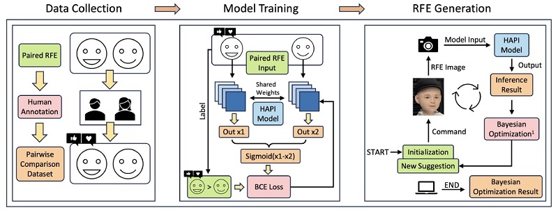 具体的には,一対比較アノテーションによりヒトの嗜好データを収集し,表情評価を洗練するSiamese RankNetベースの手法「Human Affective Pairwise Impressions(HAPI)」モデルを開発した.